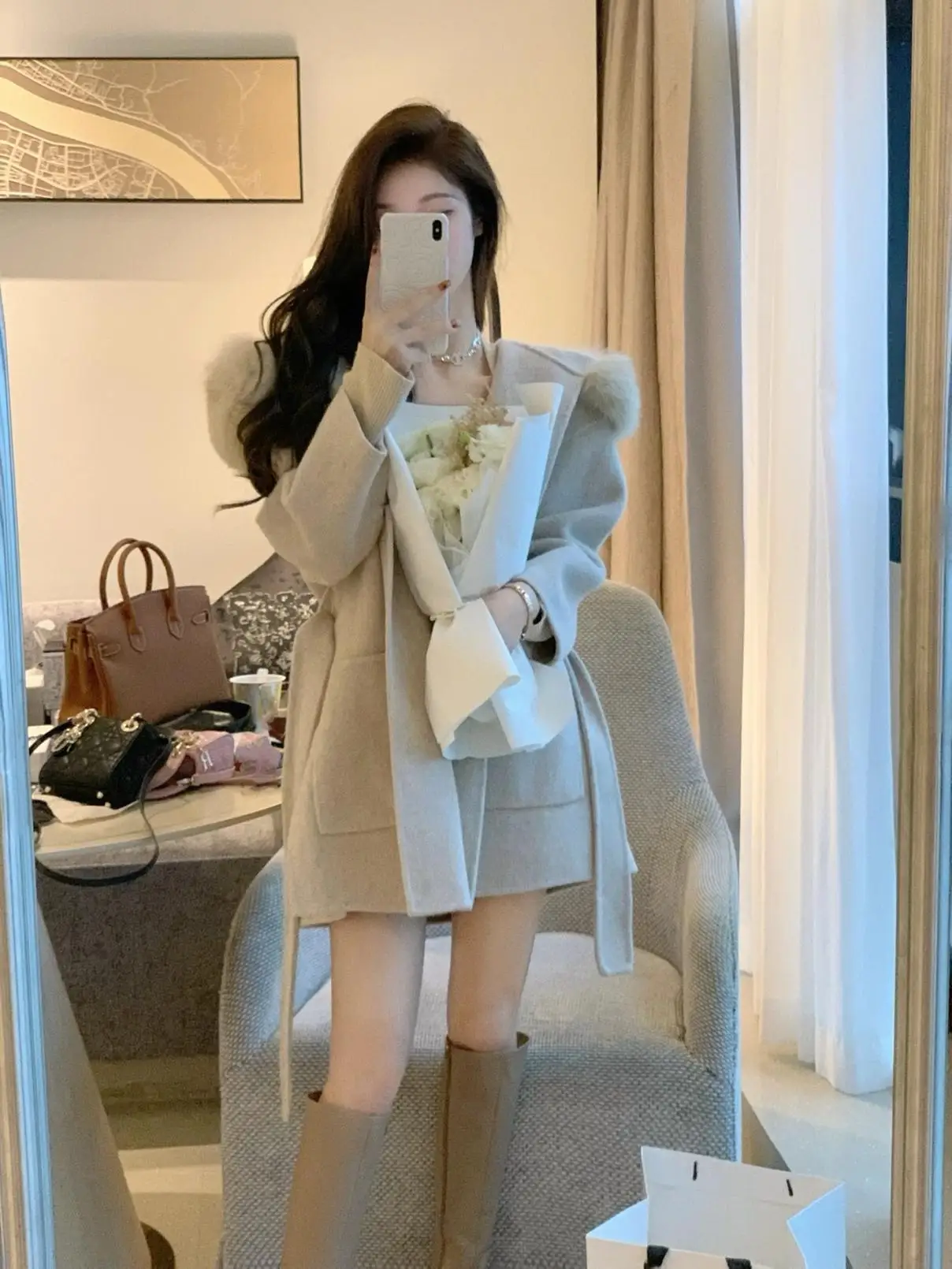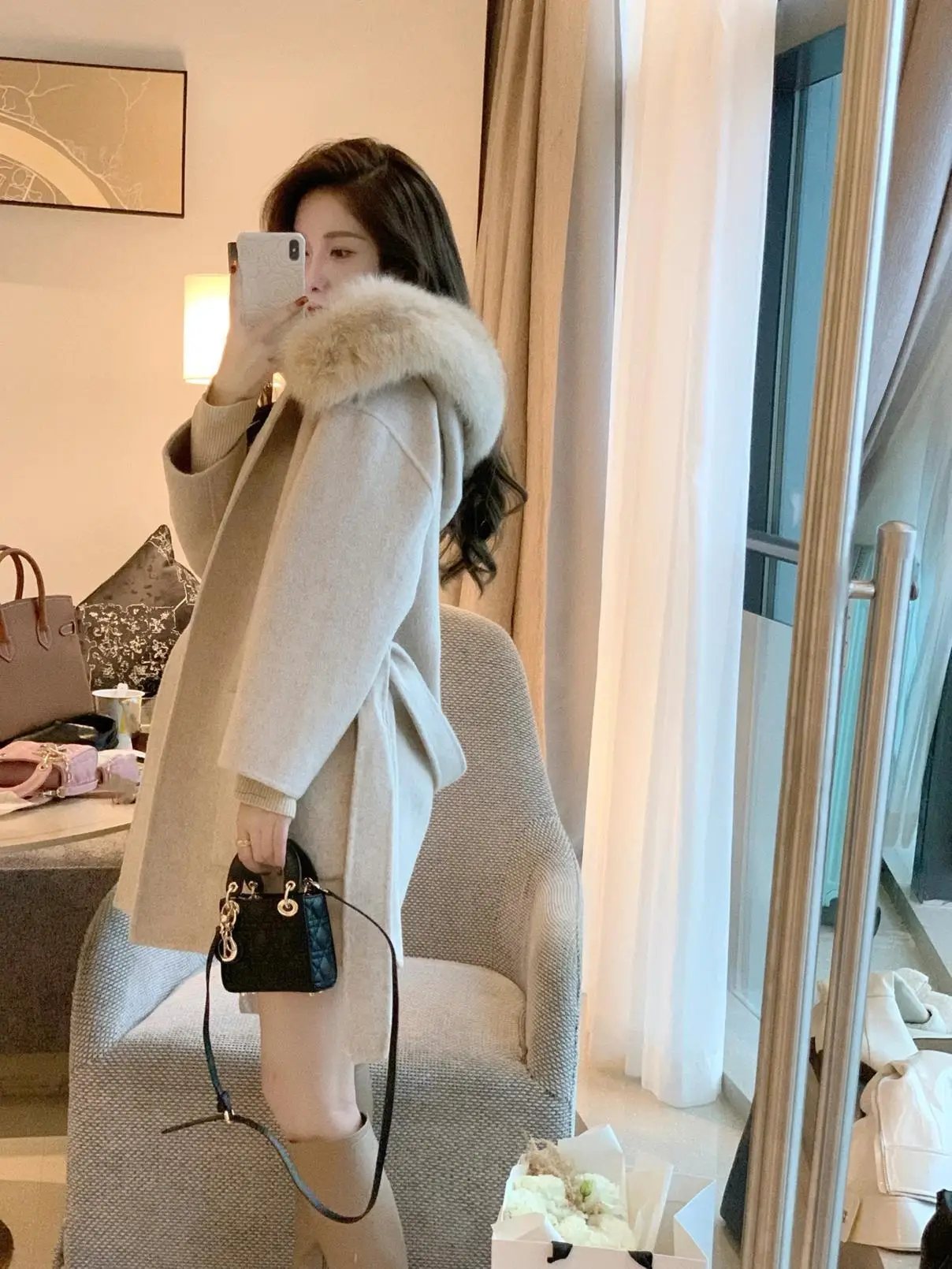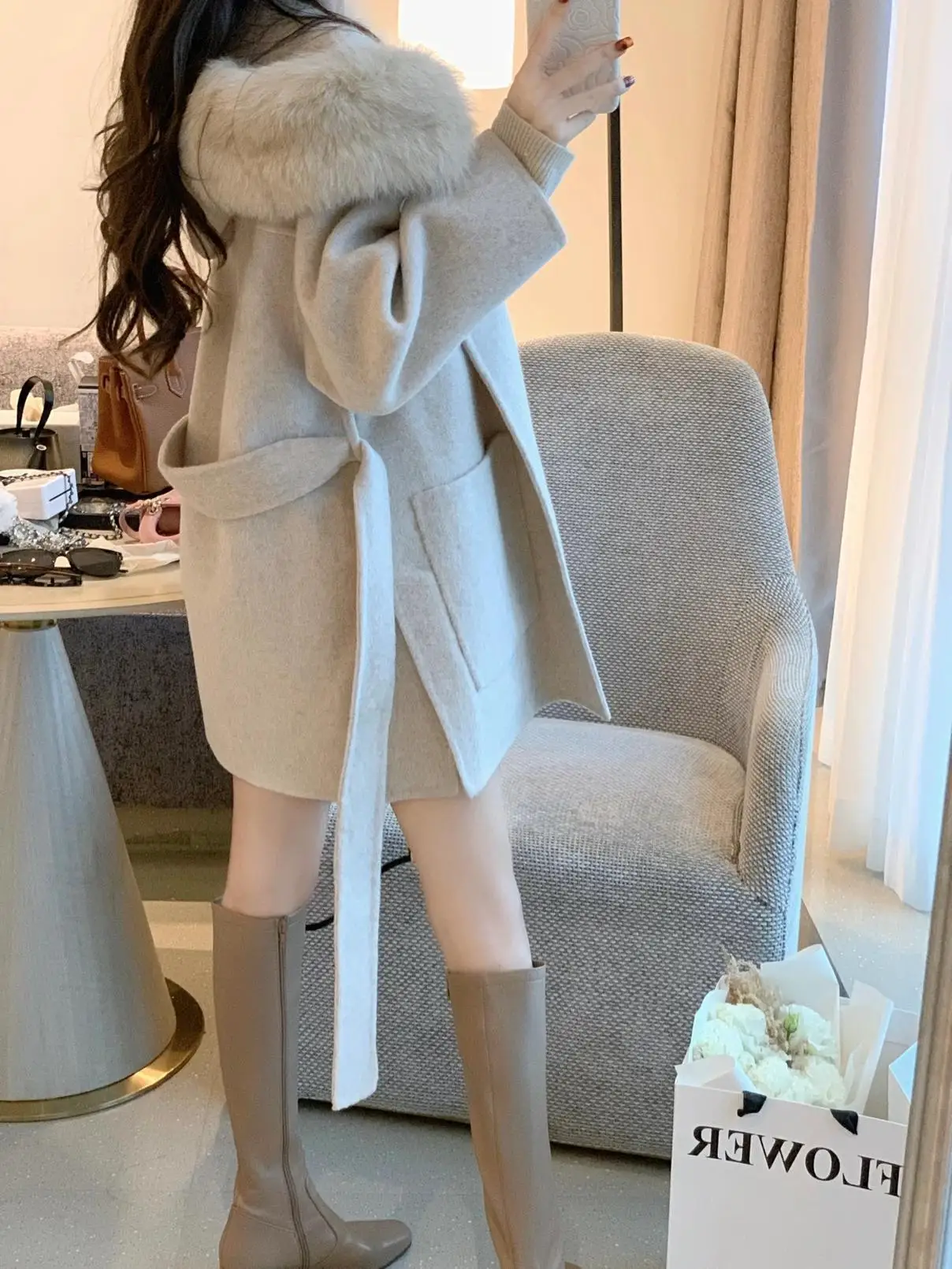 2024 S-XL Winter Warm Faux Woolen Fashion Jacket Belt Women Long Sleeves Loose Coat Thicken Overcoat With Rabbit Fur Hat