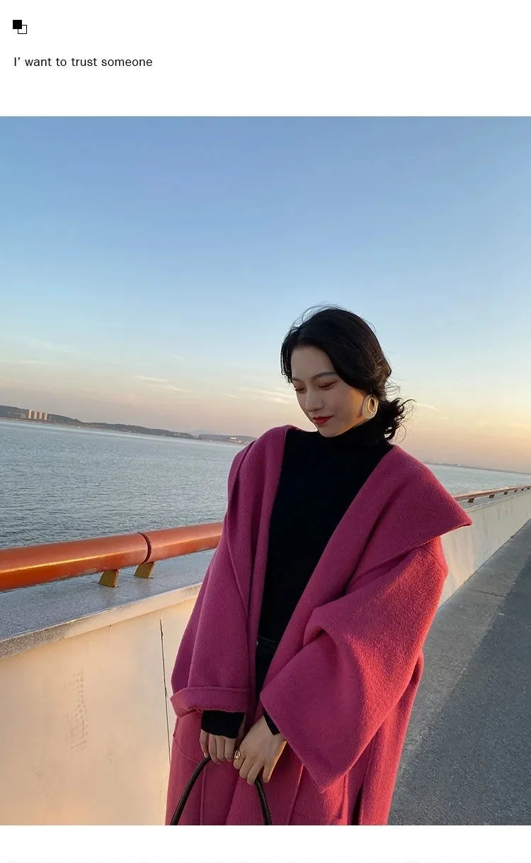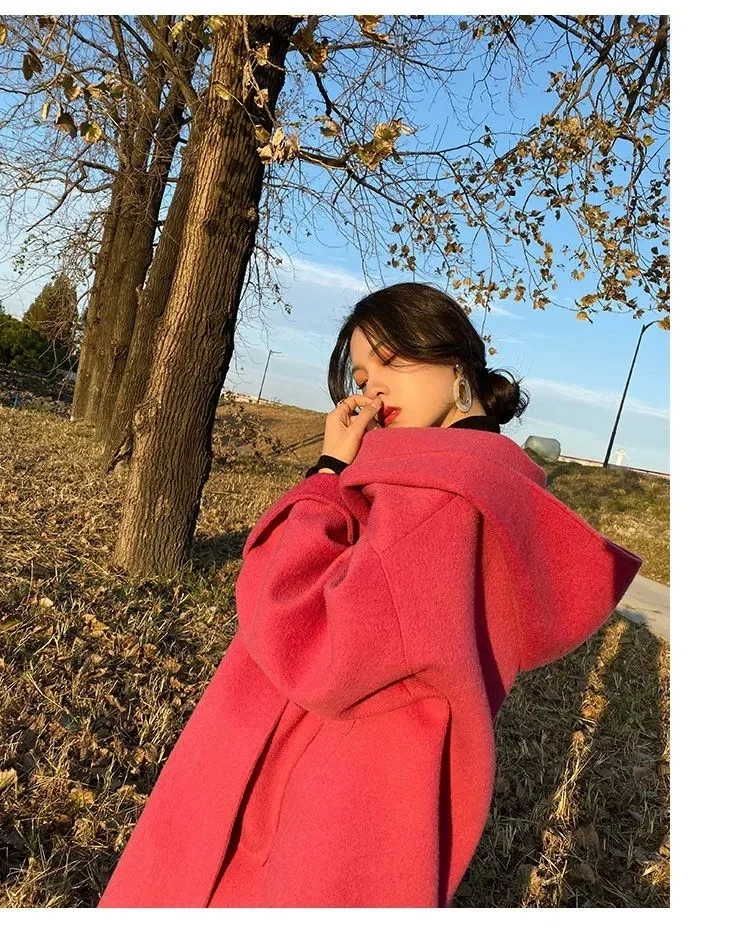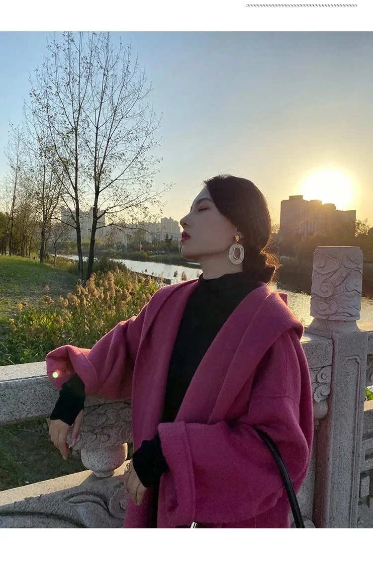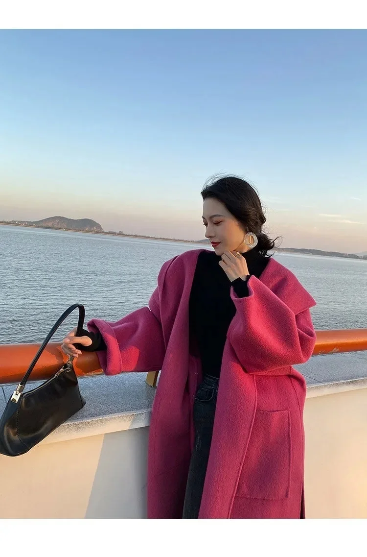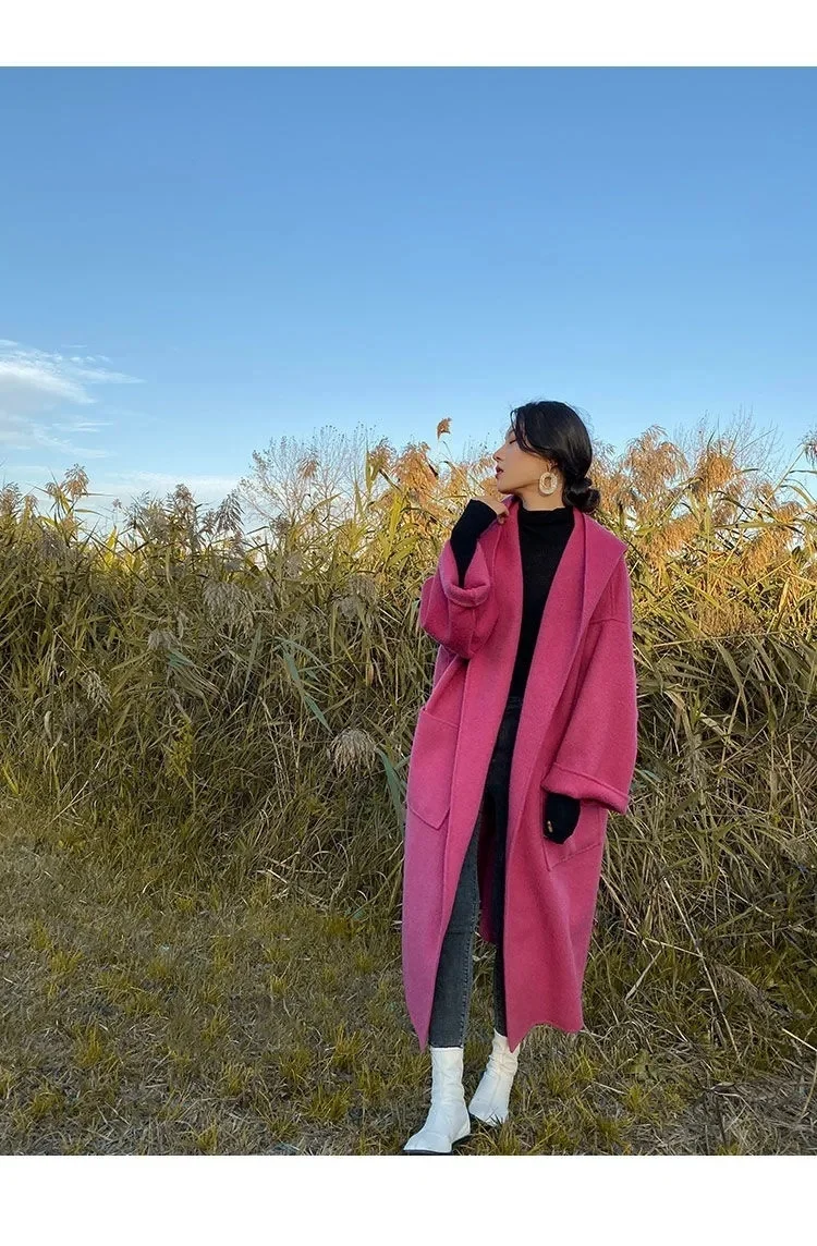 2024 Winter New Women Loose Hooded Warm Woolen Long Below The Knee Coats Female Elegant Solid Color Outwear Oversize Streetwear