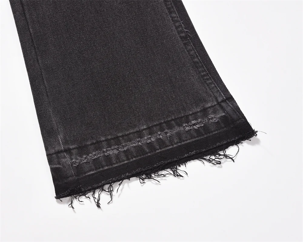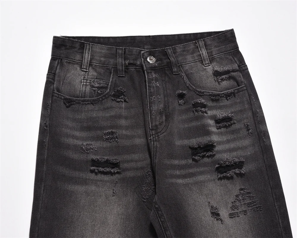 Retro Washed Black Ripped Hole Jeans Mens High Street Raw Edge Straight-leg Flared Pants Men